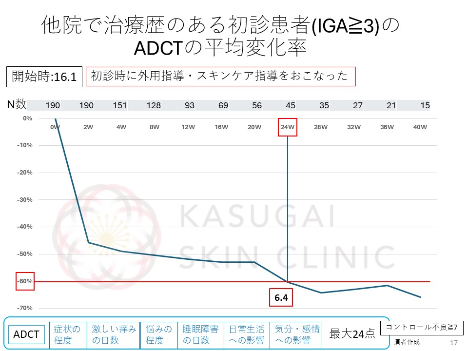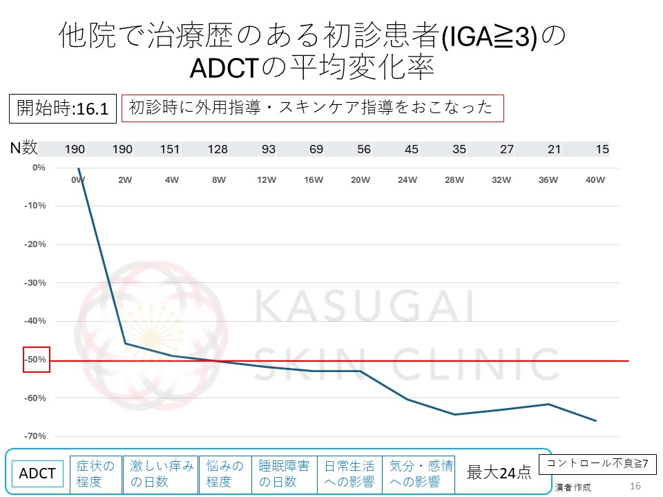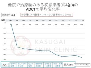 こちらの表は、他院での治療歴がある中等症以上の患者さんが当院に受診し、外用指導、スキンケア指導などを行った上でのADCTの平均値の変化率を見たものです。